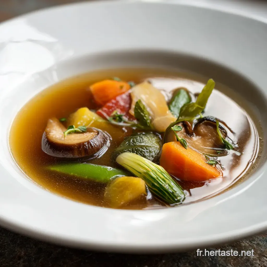 C'est une infusion liquide de légumes aromatiques. Il s'agit d'un liquide clair obtenu par mijotage lent des légumes, d'herbes et d'épices dans l'eau, servant de base riche en saveurs pour soupes ou risottos.