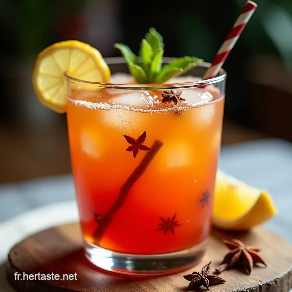 Il suffit de remplacer les 590 ml de rhum par un mélange de thé noir infusé et refroidi (pour la structure et la légère amertume) et de l'eau de coco pour l'hydratation tropicale. Le sirop épicé et les jus restent la base essentielle.