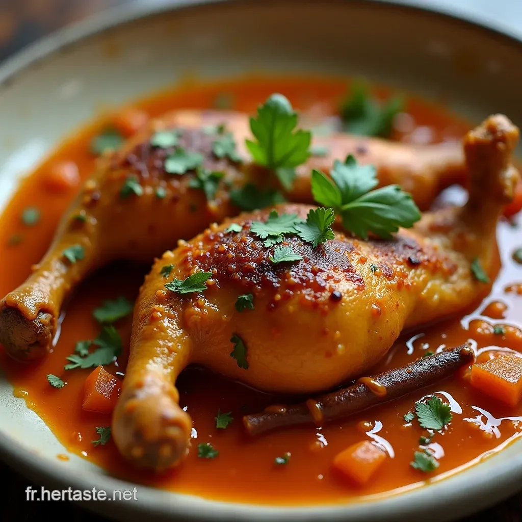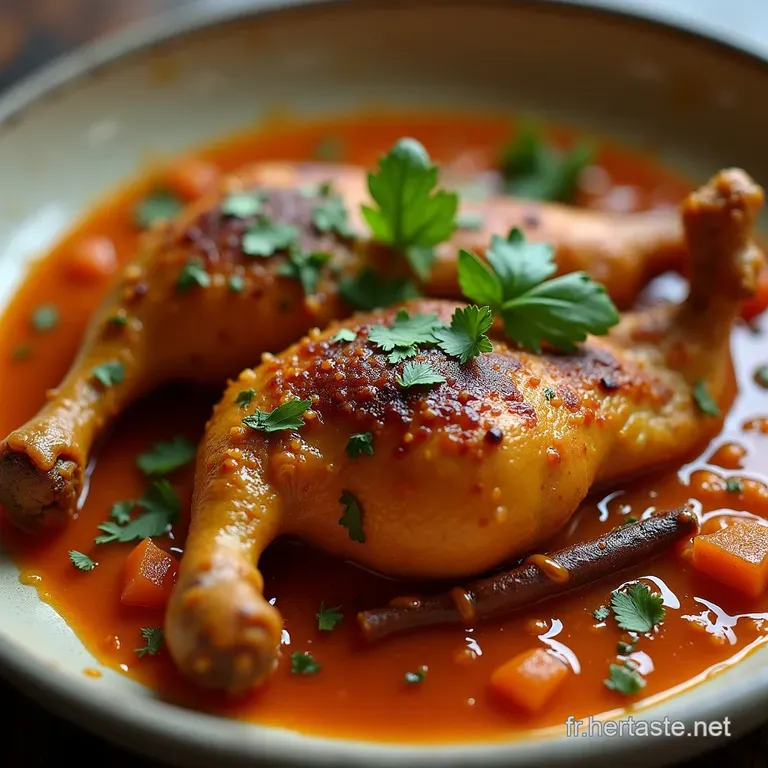 Cette méthode douce permet aux collagènes du poulet de se décomposer lentement, assurant une chair qui fond littéralement en bouche, tout en concentrant les arômes dans une sauce d’une profondeur inégalée.