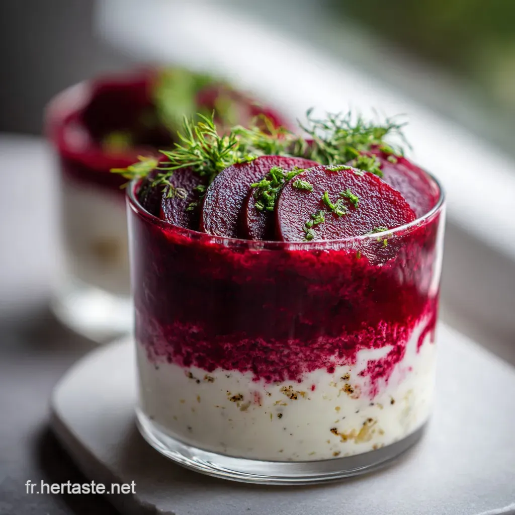 Le dressage est la moitié du plaisir avec les verrines betterave fromage frais. Pour un look moderne, n'hésite pas à incliner tes verres pendant que tu verses une première couche de crème de fromage nature, laisse prendre au frais, puis ajoute la mousse de betterave par dessus.